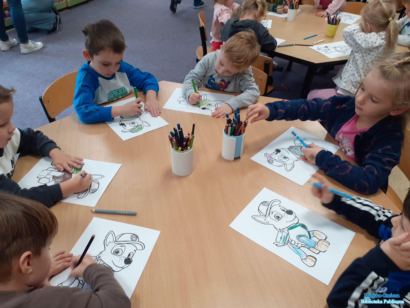 Kolejną atrakcją dla dzieci było wysłuchanie pięknej bajki „Kotka Psotka” przy wykorzystaniu teatrzyku kamishibai. Na zakończenie wizyty przedszkolaki pokolorowały ulubione postacie z Psiego Patrolu. Pani bibliotekarka zaprosiła dzieci oraz ich rodziców do udziału w ogólnopolskiej kampanii czytelniczej „Mała Książka – Wielki Człowiek”.